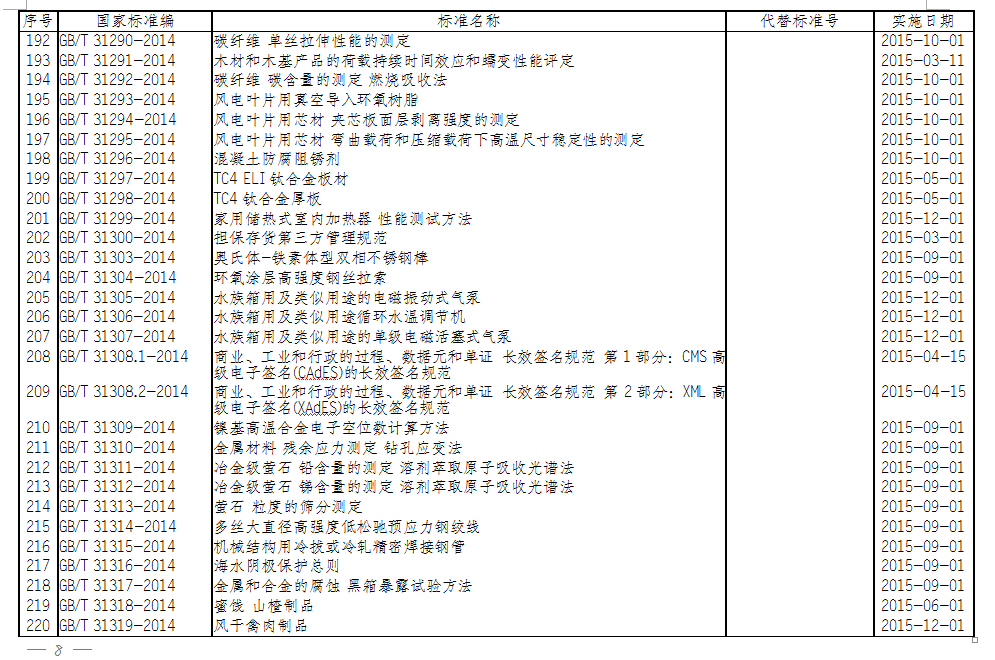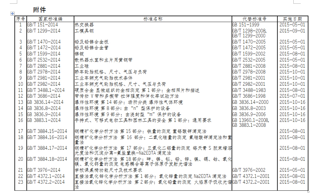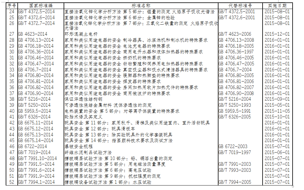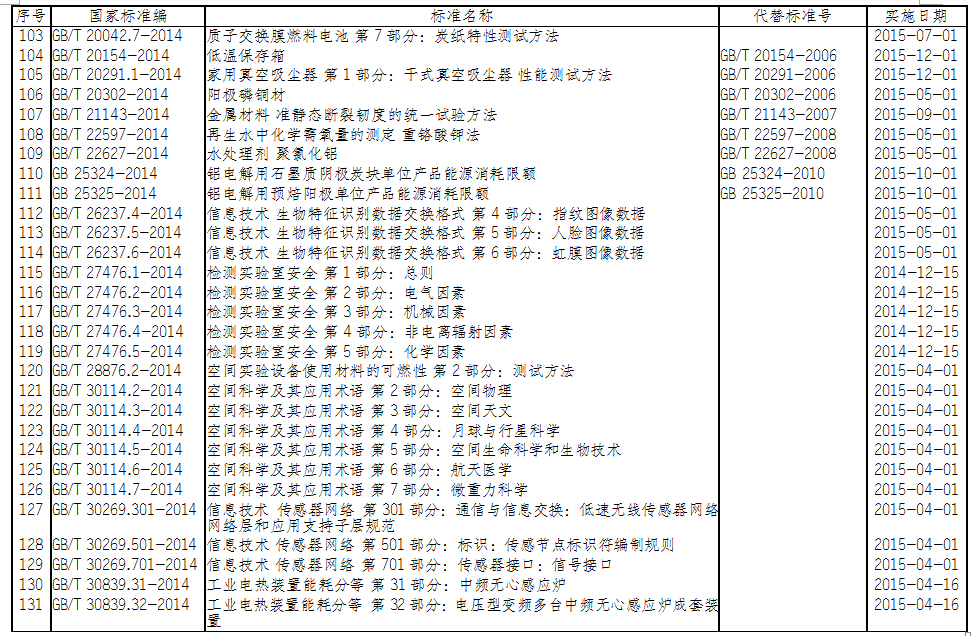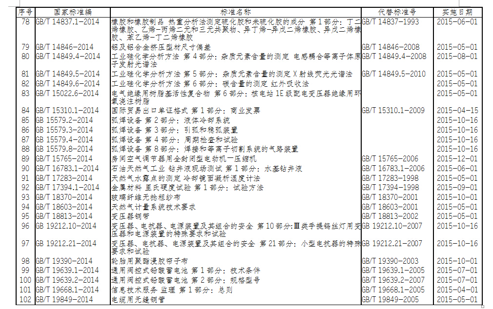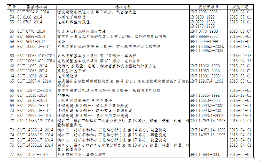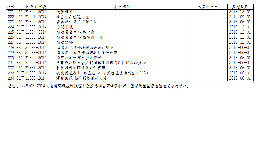 國家質(zhì)量監(jiān)督檢驗(yàn)檢疫總局、國家標(biāo)準(zhǔn)化管理委員會(huì)批準(zhǔn)《熱交換器》等234項(xiàng)國家標(biāo)準(zhǔn),現(xiàn)予以公布(見附件)國家質(zhì)檢總局 國家標(biāo)準(zhǔn)委 2014年12月5日