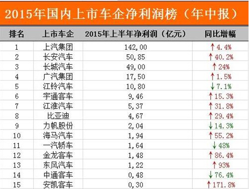 2015年上半年,江鈴汽車(chē)股份有限公司銷(xiāo)售了133,251輛整車(chē),比去年同期增加0.24%,包括59,804輛卡車(chē)、29,114輛皮卡、10,918輛馭勝品牌SUV、33,415輛福特全順系列商用車(chē)?偖a(chǎn)量為130,961輛,其中卡車(chē)60,211輛,皮卡27,666輛,馭勝品牌SUV11,324輛,全順商用車(chē)31,760輛。 宇通客車(chē) 2015年中報(bào)凈利潤(rùn)9.46億元同比增長(zhǎng)15.3% 半年報(bào)顯示,其上半年?duì)I業(yè)收入為103.87億元,同比增長(zhǎng)10.42%;歸屬上市公司股東凈利潤(rùn)9.46億元,同比增長(zhǎng)15.35%。 宇通能夠逆勢(shì)上揚(yáng),主要得益于新能源客車(chē)領(lǐng)域的暴漲。數(shù)據(jù)顯示,1~6月宇通客車(chē)實(shí)現(xiàn)整車(chē)銷(xiāo)售2.41萬(wàn)輛,同比增長(zhǎng)2.95%,其中,新能源客車(chē)銷(xiāo)售3645輛,同比增長(zhǎng)102.7%。目前宇通已形成10~18米系列化插電式混合動(dòng)力客車(chē)產(chǎn)品和6~12米純電動(dòng)客車(chē)產(chǎn)品,并在新能源產(chǎn)品市場(chǎng)占有率大幅領(lǐng)先。其中,插電式混合動(dòng)力客車(chē)國(guó)內(nèi)市場(chǎng)占有率在40%左右,純電動(dòng)客車(chē)也超過(guò)20%。得益于新能源客車(chē)銷(xiāo)量的提升,宇通客車(chē)近期獲得鄭州市30.4億元的國(guó)家新能源汽車(chē)推廣補(bǔ)貼。 江淮汽車(chē) 2015年中報(bào)凈利潤(rùn)5.37億元 同比增長(zhǎng)31.8% 江淮汽車(chē)8月10日披露2015年半年報(bào),2015年1-6月份,公司實(shí)現(xiàn)營(yíng)業(yè)總收入235.17億元,同比增長(zhǎng)14.55%,由于結(jié)構(gòu)優(yōu)化調(diào)整,上半年公司實(shí)現(xiàn)歸屬于母公司所有者的凈利潤(rùn)5.37億元,同比增長(zhǎng)31.79%。 江淮汽車(chē)表示,在行業(yè)增速放緩、競(jìng)爭(zhēng)加劇等背景下,公司積極進(jìn)行產(chǎn)品結(jié)構(gòu)的優(yōu)化調(diào)整,整體銷(xiāo)量逆勢(shì)增長(zhǎng),1-6月份公司累計(jì)銷(xiāo)售各類(lèi)汽車(chē)及底盤(pán)292290輛,同比增長(zhǎng)16.02%,其中SUV銷(xiāo)售110527輛,同比增長(zhǎng)535.80%,純電動(dòng)轎車(chē)銷(xiāo)售2692輛,同比增長(zhǎng)470%。 比亞迪 2015年中報(bào)凈利潤(rùn)4.67億元 同比增長(zhǎng)29.4% 比亞迪8月26日晚間披露中報(bào)顯示,公司2015年上半年實(shí)現(xiàn)營(yíng)業(yè)收入315.82億元,同比增長(zhǎng)18.22%;歸屬于上市公司股東的凈利潤(rùn)4.67億元,同比增長(zhǎng)29.38%;基本每股收益0.19元。 比亞迪半年報(bào)指出,上半年汽車(chē)及相關(guān)產(chǎn)品業(yè)務(wù)的收入為約177.29億元,同比上升40.19%,其中新能源汽車(chē)業(yè)務(wù)收入約59.76億元,同比增長(zhǎng)約1.2倍,占集團(tuán)總收入的比例增至18.92%。 新能源汽車(chē)行業(yè)蓬勃發(fā)展,讓比亞迪遇到千載難逢的機(jī)遇。2015年上半年其在新能源汽車(chē)領(lǐng)域的市場(chǎng)份額為29.8%,在插電式混合動(dòng)力市場(chǎng)份額持續(xù)提升,繼續(xù)主導(dǎo)新能源汽車(chē)私家車(chē)市場(chǎng)。在乘用車(chē)方面,比亞迪“秦”持續(xù)穩(wěn)坐國(guó)內(nèi)新能源車(chē)銷(xiāo)售冠軍。中國(guó)汽車(chē)工業(yè)協(xié)會(huì)統(tǒng)計(jì)數(shù)據(jù)顯示,1~7月“秦”累計(jì)銷(xiāo)量達(dá)到了2.05萬(wàn)輛,累計(jì)同比增長(zhǎng)220%。 除了新能源車(chē)給力之外,比亞迪傳統(tǒng)燃油汽車(chē)也保持相對(duì)穩(wěn)定的增長(zhǎng),SUV車(chē)型S7以及比亞迪的3系車(chē)型等為比亞迪傳統(tǒng)燃油汽車(chē)銷(xiāo)量帶來(lái)持續(xù)的增長(zhǎng)動(dòng)力。2015年上半年,比亞迪汽車(chē)總銷(xiāo)量同比增長(zhǎng)13.98%至約21萬(wàn)輛。 力帆股份 2015年中報(bào)凈利潤(rùn)2.04億元 同比減少14.3% 報(bào)告期內(nèi),公司實(shí)現(xiàn)營(yíng)業(yè)收入50.63億元,比上年同期增長(zhǎng)3.34%,歸屬于母公司股東的凈利潤(rùn)2.04億元,同比下降14.33%;出口金額27.15億元,出口金額保持重慶市汽摩行業(yè)第一,其中轎車(chē)(含SUV)出口位列中國(guó)自主品牌出口第三名。 同時(shí),公司前6個(gè)月乘用車(chē)實(shí)現(xiàn)銷(xiāo)售收入33.5億元,同比增長(zhǎng)9.79%,其中出口18.35億元,同比下降21.12%。摩托車(chē)實(shí)現(xiàn)銷(xiāo)售15.17億元,其中出口7.69億元,同比增長(zhǎng)0.85%,菲律賓、南美主要市場(chǎng)上升明顯。 海馬汽車(chē) 2015年中報(bào)凈利潤(rùn)1.94億元 同比增長(zhǎng)55.2% 8月29日,海馬汽車(chē)公布了2015年半年報(bào)。報(bào)告期內(nèi),公司實(shí)現(xiàn)營(yíng)業(yè)收入600,484萬(wàn)元,同比增長(zhǎng)6.57%;營(yíng)業(yè)利潤(rùn)24,759萬(wàn)元,同比增長(zhǎng)32.4%;歸屬于上市公司股東的凈利潤(rùn)19,353萬(wàn)元,同比增長(zhǎng)55.17%;久抗墒找鏋0.1177元。 海馬汽車(chē)表示,主要是車(chē)企營(yíng)業(yè)收入的同比增長(zhǎng)及汽車(chē)產(chǎn)品結(jié)構(gòu)的調(diào)整,有效提升了企業(yè)經(jīng)濟(jì)效益。 一汽轎車(chē) 2015年中報(bào)凈利潤(rùn)1.64億元 同比減少48% 一汽轎車(chē)8月28日晚間披露了2015年半年報(bào),公司在2015年上半年實(shí)現(xiàn)營(yíng)業(yè)收入138億元,較去年同期減少13.39%,歸屬于上市公司股東的凈利潤(rùn)1.64億元,較去年同期減少48%;歸屬于上市公司股東的扣除非經(jīng)常性損益的凈利潤(rùn)1.5億元,較去年同期減少51.75%。 對(duì)于業(yè)績(jī)下滑,一汽轎車(chē