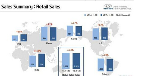 現(xiàn)代汽車日前發(fā)布了2015年第三季度業(yè)績報告,上季度受中國等市場銷量下滑影響,該公司營業(yè)收入雖實現(xiàn)了10%的增長,但凈利潤遭遇了25%的下滑,至此現(xiàn)代汽車凈利潤已連續(xù)下滑7個季度。 Q3全球批售銷量跌0.6% 在華減17%