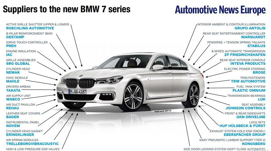 《歐洲汽車新聞》日前發(fā)布寶馬新7系主要配套供應(yīng)商:汽車零部件網(wǎng)整理如下: 主動進(jìn)氣格柵(上/下):德國勞士領(lǐng)汽車(Roechling Automotive) B柱(白車身):西班牙海斯坦普 IDrive 控制器:德國普瑞(Preh) 發(fā)動機(jī)隔熱套:國際汽車零部件集團(tuán)IAC 格柵總成:飾而杰國際(SRG Global) 汽缸蓋:尼瑪克 暖通空調(diào)模塊:德國馬勒 駕駛員氣囊:日本高田公司 空氣供給裝置:比利時威伯科 風(fēng)道:德國瑞好(Rehau) 座椅皮革:丹麥柏德 儀表板:德國諾維汽車內(nèi)飾件 缸頭墊片:德國愛爾鈴克鈴爾 空氣彈簧模塊:德國TrelleborgVibracoustic(特瑞堡與科德寶合資公司) 高/低壓廢氣再循環(huán)系統(tǒng)閥門:KSPG AUTOMOTIVE 內(nèi)飾環(huán)境/照明燈:西班牙安通林 后排娛樂系統(tǒng)控制器:德國馬夸特 電動尾門+拉簧后擋板:德國斯泰必魯斯 8速自動變速箱:采埃孚 后座控制臺:恩坦華產(chǎn)品集團(tuán) 電動助力轉(zhuǎn)向(EPS):德國博澤 緊固件:天合汽車集團(tuán) 油箱系統(tǒng):全耐塑料(原奧姆尼塑料) 變速箱軸承:LUK(舍弗勒子公司) 座椅總成:江森自控 前/后側(cè)軸:吉凱恩傳動系統(tǒng) 門鎖裝置:胡夫•許爾斯貝克和福斯特(HUF HÜLSBECK & FÜRST) 排氣系統(tǒng)冷端(柴油):埃貝赫集團(tuán) 氣動腰部支撐 [二級供應(yīng)商]:康斯博格