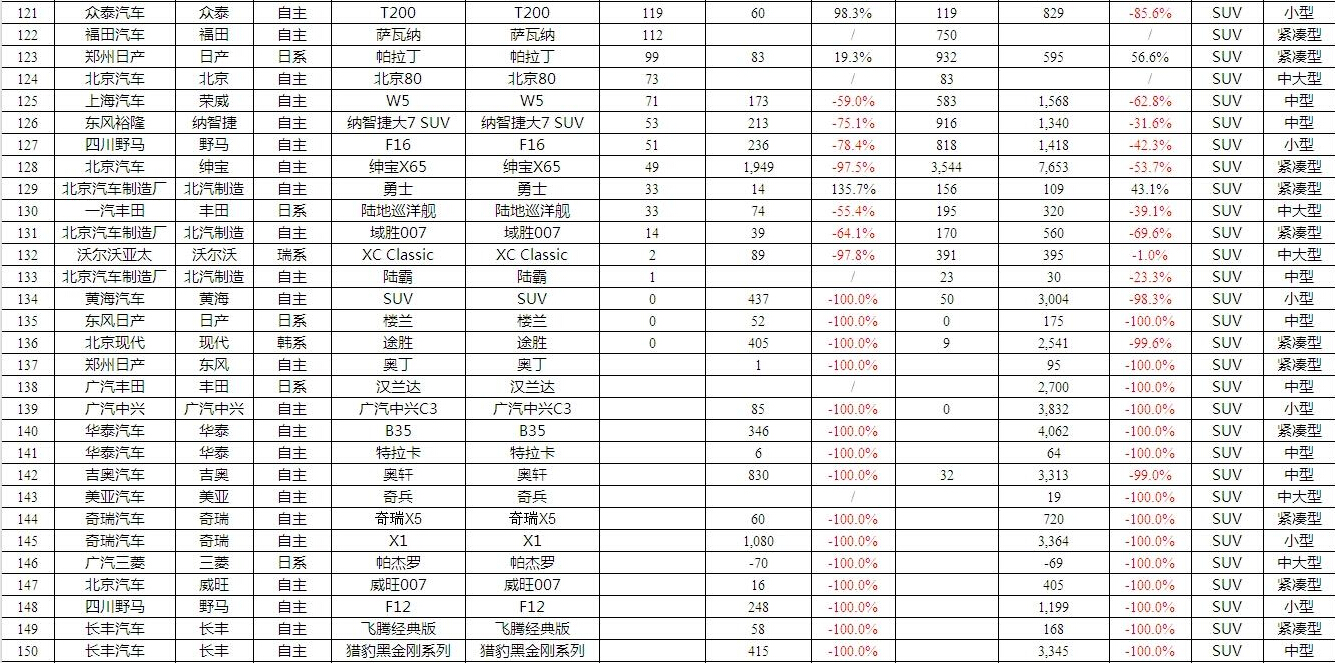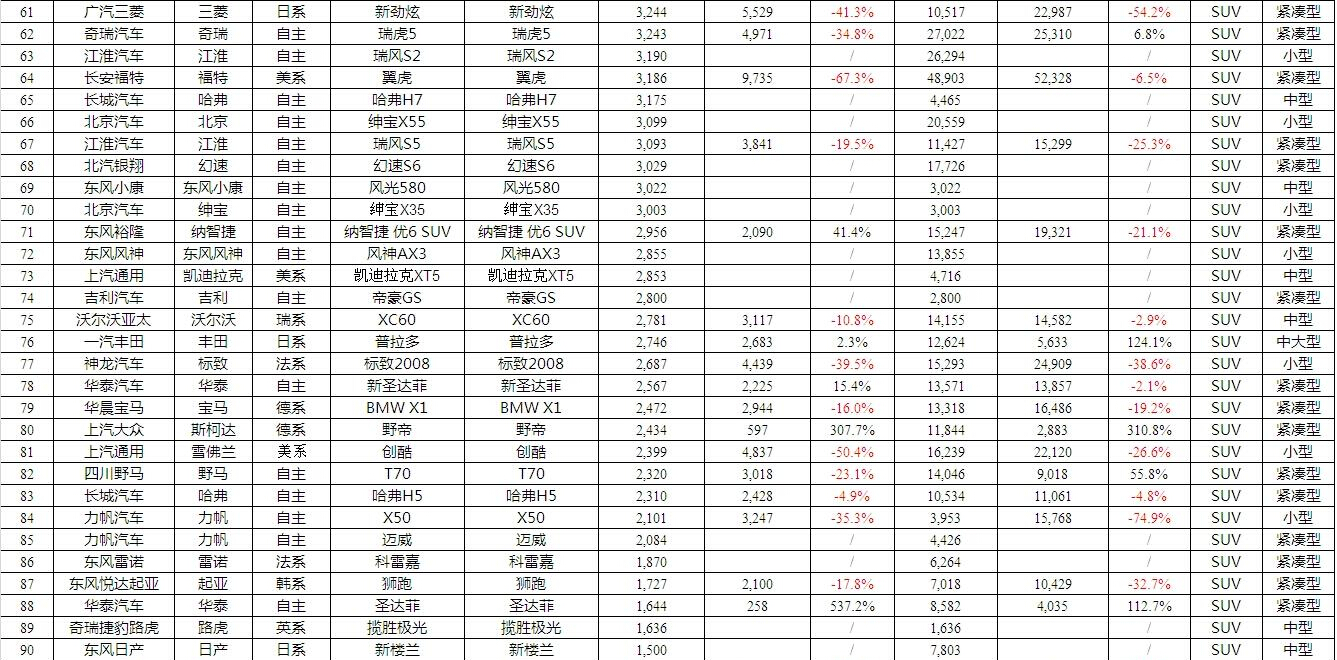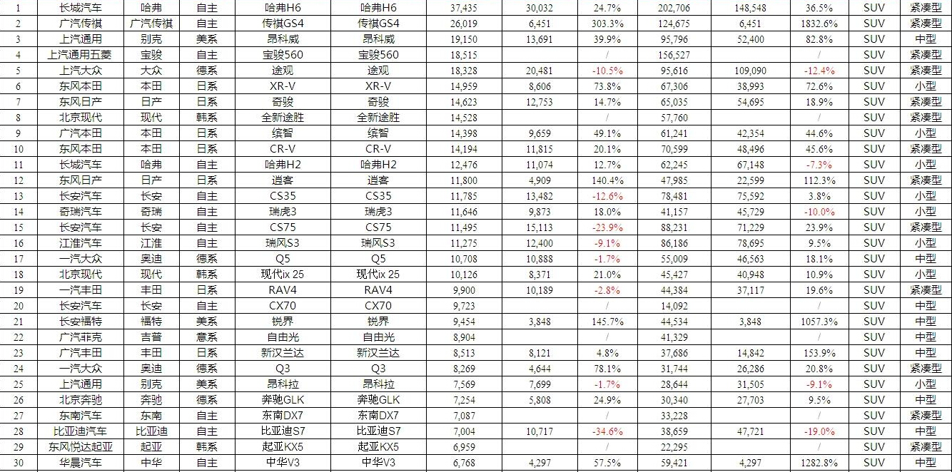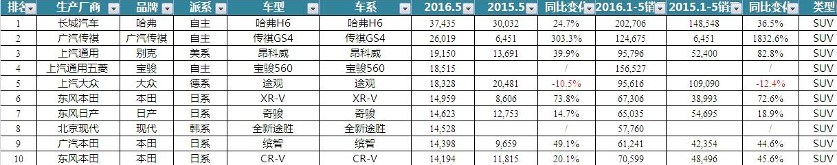 2016年5月份SUV銷量情況通報前十自主僅剩3款暴露短板
