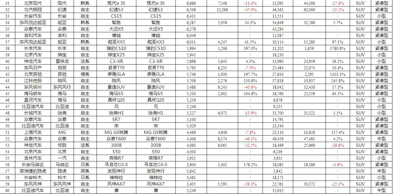而本田XR-V以同比73.8%的同比增長領(lǐng)銜合資品牌;而北京現(xiàn)代全新途勝也以14,528臺的成績成功殺入銷量前十,全新途勝也因此成為前十車型中唯一一款韓系品牌產(chǎn)品。