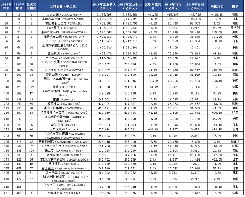 中國(guó)車企在世界500強(qiáng)占得6個(gè)席位作者:左丹 來(lái)源:中國(guó)汽車零部件 時(shí)間:2016/7/22 10:34:09 500強(qiáng)中汽車行業(yè)企業(yè)名單 以下是《財(cái)富》世界500強(qiáng)中汽車行業(yè)企業(yè)名單,從左到右分別為今年總排名、去年總排名、名次變化、公司名稱、本財(cái)年和上財(cái)年?duì)I業(yè)收入(單位:億美元)、營(yíng)收同比變化、本財(cái)年和上財(cái)年利潤(rùn)、利潤(rùn)同比變化和國(guó)家: