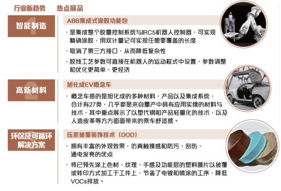 其他熱點(diǎn)產(chǎn)品/技術(shù)有: ♢環(huán)保材料及工藝:免噴涂、低VOCs、低氣味、低揮發(fā)材料、模內(nèi)噴涂; ♢輕量化材料及工藝:碳纖維、薄壁化、SMC、GMT、物理/化學(xué)微發(fā)泡工藝; ♢高感官質(zhì)量材料:防眩光、纖維質(zhì)感材料、降噪材料; ♢智能表面裝飾工藝:IMD、TOM、INS工藝 ♢3D打印技術(shù)等 ☆ 群英薈萃,業(yè)界共襄盛舉