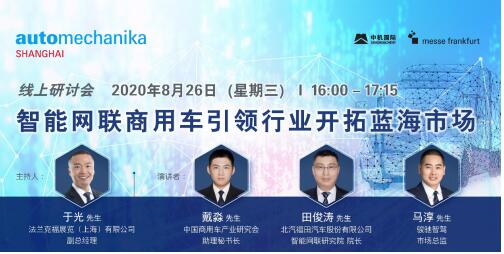 Automechanika Shanghai線上研討會 | 8月26日智能網(wǎng)聯(lián)商用車引領(lǐng)行業(yè)開拓藍海市場作者:網(wǎng)站管理員 來源:中國汽車零部件 時間:2020/8/21 10:25:27 智能網(wǎng)聯(lián)商用車引領(lǐng)行業(yè)開拓藍海市場 日期:2020年8月26日 時間:16:00 — 17:15 語言:以普通話進行 主辦單位:中國機械國際合作股份有限公司 法蘭克福展覽(上海)有限公司