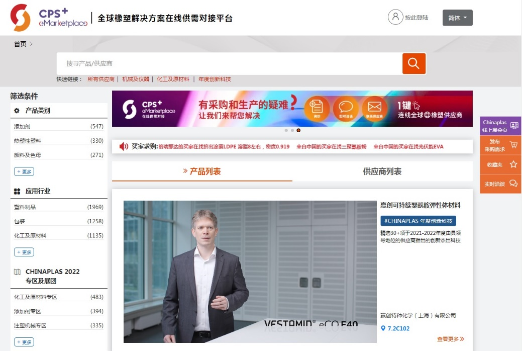 觀眾人數(shù)突破20萬,CHINAPLAS線上展會圓滿收官 CPS+ 在線供需對接平臺365天不落幕,明年4月深圳見作者:網(wǎng)站管理員 來源:國際橡塑官方網(wǎng)站 時間:2022/6/24 9:07:58 6月14日,“橡塑創(chuàng)新科技,連線全球:CHINAPLAS 2022線上展會”落下帷幕。CHINAPLAS首次登云便取得不俗戰(zhàn)績,海內(nèi)外觀眾人數(shù)達(dá)218,995。 “在世界級橡塑展當(dāng)中,CHINAPLAS首試舉辦線上展會,致力推動全球橡塑業(yè)在特殊時期的商貿(mào)和技術(shù)交流,鏈接上下游企業(yè)以應(yīng)對疫情沖擊,承接第二季度商貿(mào)合作黃金期的市場需求,踐行全球領(lǐng)先橡塑交流平臺之責(zé)任與擔(dān)當(dāng)。”雅式展覽服務(wù)有限公司總經(jīng)理梁雅琪女士談到。 4,000+供應(yīng)商亮出絕活 在這場橡塑圈的云聚會上,“內(nèi)功深厚”的4,000+供應(yīng)商搭乘“云快車”,重磅推出5,000+精選產(chǎn)品。當(dāng)中既有來自全球的橡塑巨頭帶來前沿技術(shù),也有中國的“專精特新”企業(yè)攜核心科技各顯身手。超多年度創(chuàng)新科技、首發(fā)技術(shù)以圖文、視頻、線上會議、主題專輯等形式展現(xiàn),令觀眾大飽眼福。 推進上下游高效對接 “CPS+ 在線供需對接平臺”的關(guān)鍵詞搜索、實時洽談、發(fā)布采購需求等豐富的功能,拓寬了買家與供應(yīng)商溝通的渠道,幫助上下游高效互動、需求匹配。據(jù)統(tǒng)計,與開展的前一個月相比,該平臺的流量增長超過300%,展會期間的觀眾有超過3成來自海外, 首20位海外國家及地區(qū)來自巴基斯坦、印度、美國、馬來西亞、菲律賓、墨西哥、越南、印尼、韓國、巴西、日本、泰國、意大利、英國、埃及等,可見全球潛力買家的需求量大。