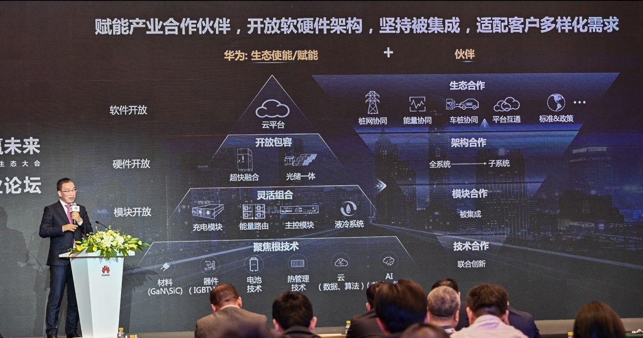 中國電動汽車充電基礎(chǔ)設(shè)施促進(jìn)聯(lián)盟副秘書長 仝宗旗 華為數(shù)字能源技術(shù)有限公司智能電動&充電網(wǎng)絡(luò)營銷副總裁戴景岳在會上發(fā)表了主題為“聚力高質(zhì)量充電,共贏電動化未來”的演講。他表示在交通電動化的充電網(wǎng)絡(luò)領(lǐng)域,華為數(shù)字能源將聚焦根技術(shù),發(fā)揮數(shù)字技術(shù)與電力電子技術(shù)兩大領(lǐng)域的優(yōu)勢,深度賦能產(chǎn)業(yè)合作伙伴,開放軟硬件架構(gòu),向伙伴提供生態(tài)合作、架構(gòu)合作、模塊合作、技術(shù)合作。聯(lián)合產(chǎn)業(yè)合作伙伴,共同打造新一代液冷超快充基礎(chǔ)設(shè)施,聚焦高速服務(wù)區(qū)、城市公共、園區(qū)光儲充三大場景,面向客戶打造多樣化、強競爭力的產(chǎn)品和解決方案,實現(xiàn)“讓新能源車用新能源電,讓有路的地方就有充電”,共同迎接綠色美好出行!