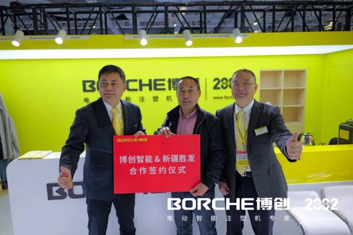 開展首日,博創(chuàng)喜迎重磅簽約——與新疆勝發(fā)塑業(yè)現(xiàn)場簽訂十臺托盤專用注塑機訂單