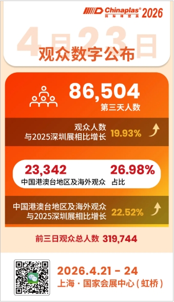 勁爆!前三天319,744名觀眾涌入展館!創(chuàng)新科技大秀今天下午5點半閉幕!快沖鴨~作者:2026國際橡塑展 來源:CHINAPLAS國際橡塑展 官方發(fā)布 時間:2026/4/24 15:34:40 展會第4天 CHINAPLAS 2026收官日!抓緊最后一天參觀時機,錯過就是明年再見了!快來! 第三天觀眾數(shù)字,來了