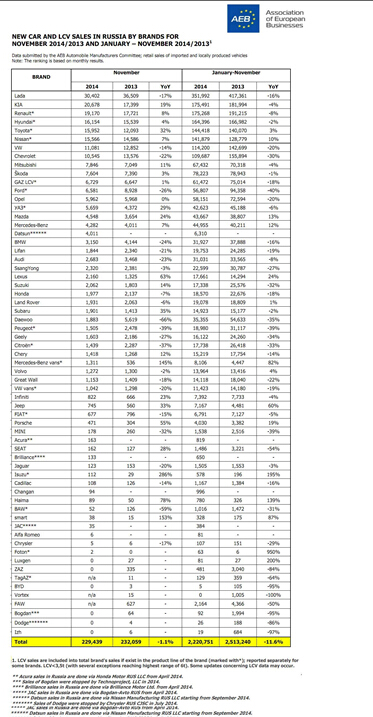 根據(jù)歐洲商會(huì)AEBRUS數(shù)據(jù),2014年11月份,俄羅斯市場輕型車(含乘用車和輕型商用車)新車銷量為229,439輛,較之2013年11月份的232,059輛,同比微跌1.1%。自從去年12月終止9個(gè)月同比下跌以來,俄羅斯車市迄今已經(jīng)連續(xù)同比滑坡11個(gè)月。從10月開始跌幅收窄至9.9%,明顯低于9月份的20.1%和8月份的25.8%。